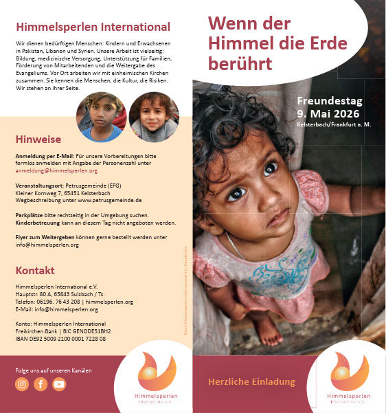 Der Himmelsperlen Freundestag in der Petrusgemeinde Kelsterbach eröffnet uns einen Blick über den eigenen Horizont hinaus. Denn die Länder des Nahen Ostens sind nicht nur von Krieg und Gewalt geprägt. Gerade inmitten von Bedrängnis und Not wirkt Gott auf kraftvolle Weise. Durch unsere Gastsprecher erhalten wir Einblicke in das besondere Wirken unserer Partnergemeinde in Syrien/Damaskus.