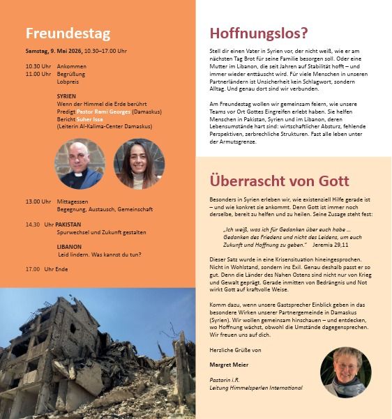 Der Himmelsperlen Freundestag in der Petrusgemeinde Kelsterbach eröffnet uns einen Blick über den eigenen Horizont hinaus. Denn die Länder des Nahen Ostens sind nicht nur von Krieg und Gewalt geprägt. Gerade inmitten von Bedrängnis und Not wirkt Gott auf kraftvolle Weise. Durch unsere Gastsprecher erhalten wir Einblicke in das besondere Wirken unserer Partnergemeinde in Syrien/Damaskus.
